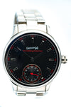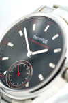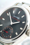 Quadrante: nero opaco con indici applicati rodiati e bombati, lavorati con raggio diamantato per un effetto luminoso. La scala dei minuti e la lancetta dei piccoli secondi sono evidenziate in rosso, conferendo un tocco di dinamismo al design sobrio.